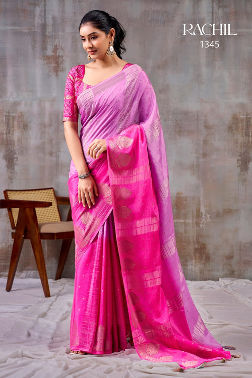 Royal Rani Pink Kesar Chinon Saree with Elegant Zari Butti | Rachil 1343 | Pranjal Premium